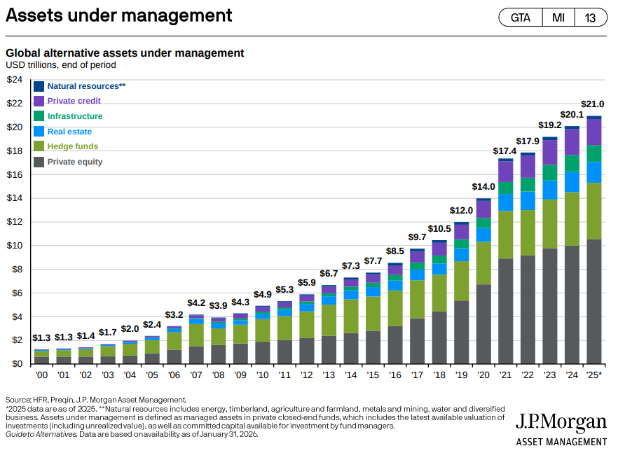 The JPMorgan chart below shows the growth across major private asset categories. The industry now represents over $21 trillion — roughly the same size as all global exchange traded funds combined.