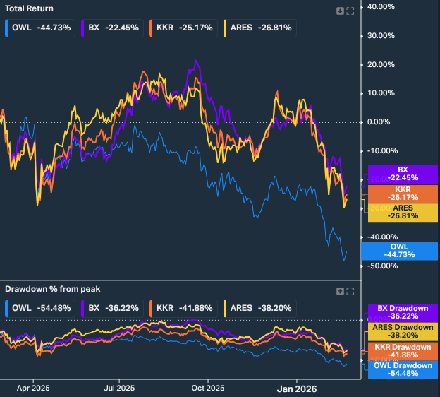 - Blackstone (BX), KKR (KKR), and Ares (ARES) are down 20–26% over the past year and 36–42% from prior highs.
